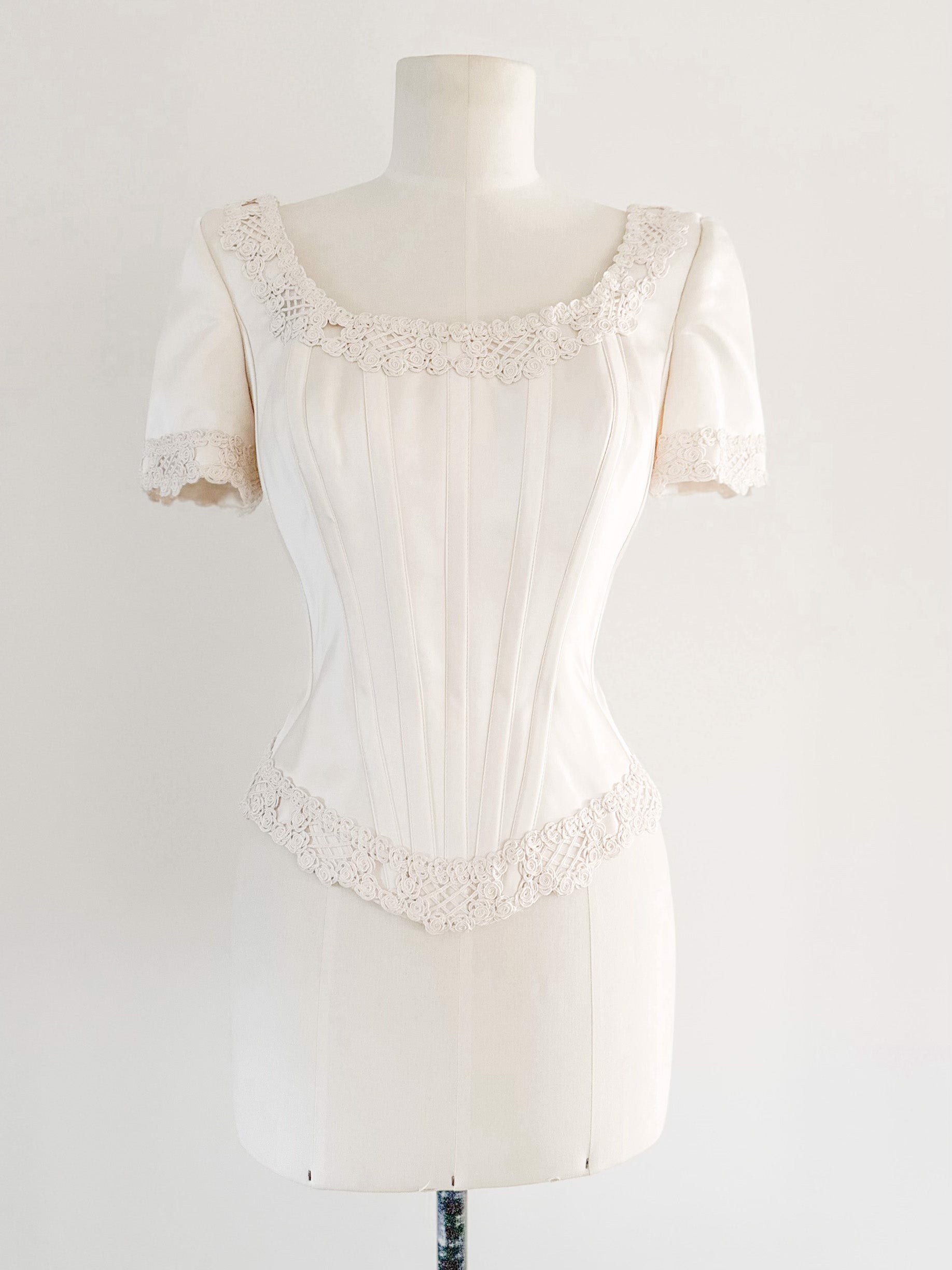 This regal corset top seamlessly blends Victorian-inspired structure with modern style. Reinforced boning creates a flattering, sculpted silhouette while traditional lacing allows for personalized fit and adjustability. Short sleeves frame the shoulders, intricate embroidery embellishments add depth and visual interest to the design. A versatile piece that transitions effortlessly from evening wear to curated everyday styling.